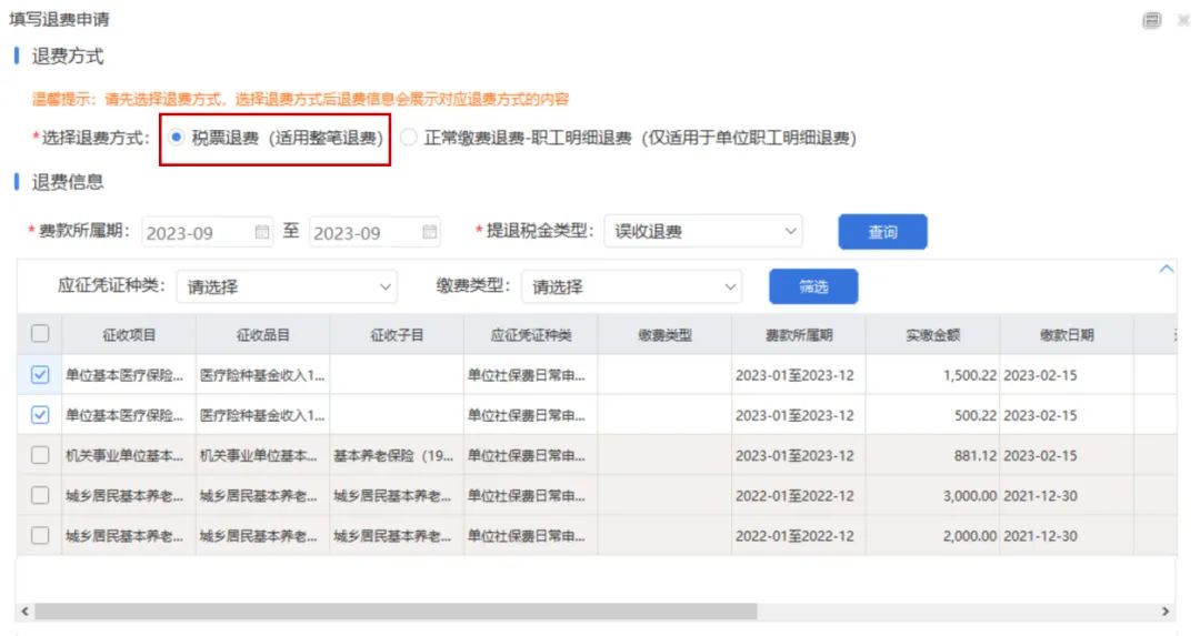 税票退费,适用整笔退费。举个例子,比如某月社保费出现重复申报缴纳的,那么可以选择这个!