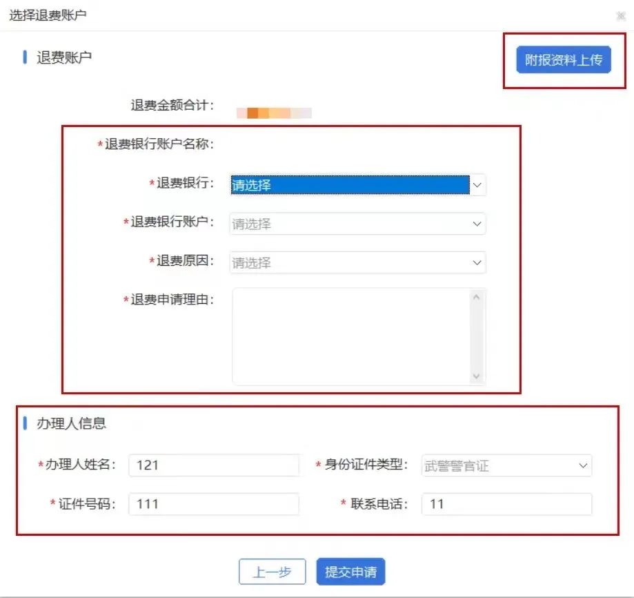 4.录入退款银行账户及办理人信息,同时点击【附报资料上传】。