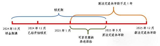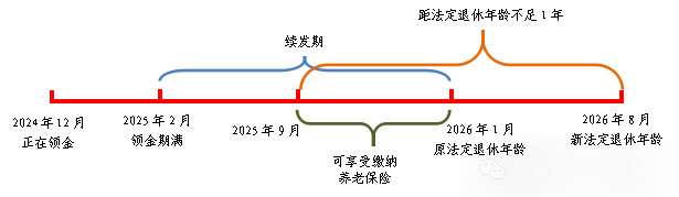 例2:乙,男职工,1965年9月出生,原法定退休年龄60周岁,2025年9月退休;2024年10月领金期满开始续发,核定续发至2025年9月。延退改革实施后,新法定退休年龄60岁3个月,2025年12月退休。属于2024年12月已经开始续发人员,核定续发时间为2024年10月,距离新法定退休年龄2025年12月超过1年,属于过渡人员,可以继续执行原核定续发期限,续发至原法定退休年龄2025年9月。在2025年1-9月期间领金同时可享受由失业保险基金缴纳养老保险费政策。